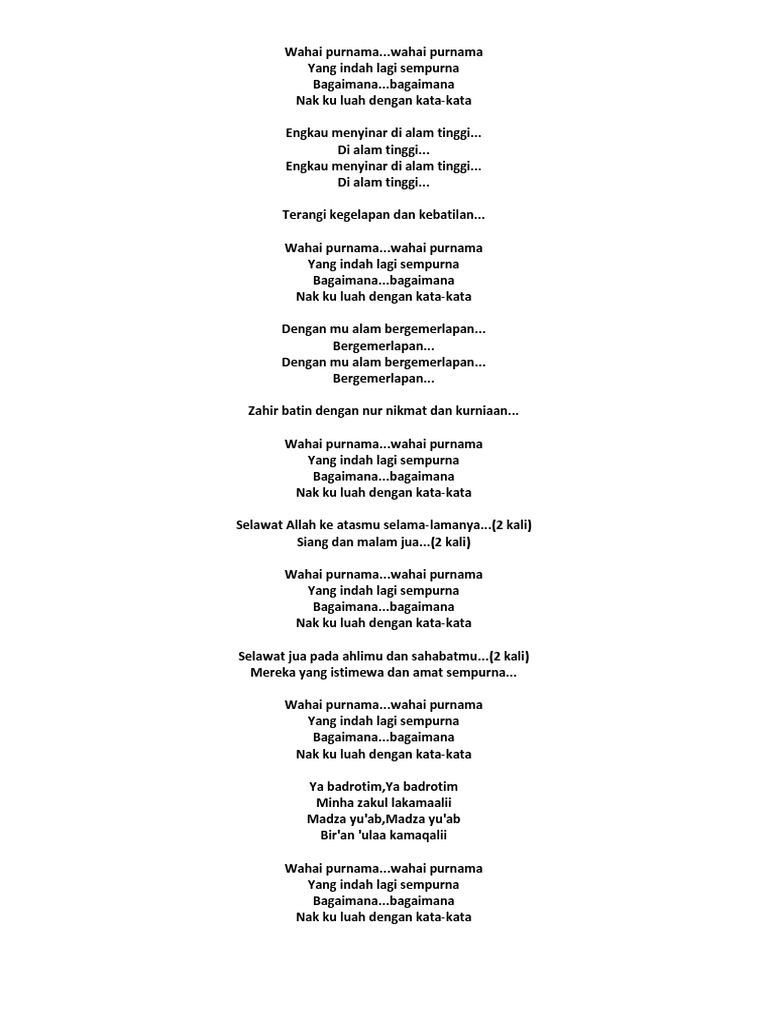 Wahai purnamawahai purnamaYang indah lagi sempurnaBagaimanabagaimanaNak ku luah dengan kata-kataEngkau menyinar di alam tinggiDi alam tinggiEngka. Lirik Lagu Wahai Purnama Ya Badrotim adalah seperti berikut. Maka hilanglah seri bulan-bulan yang lain.